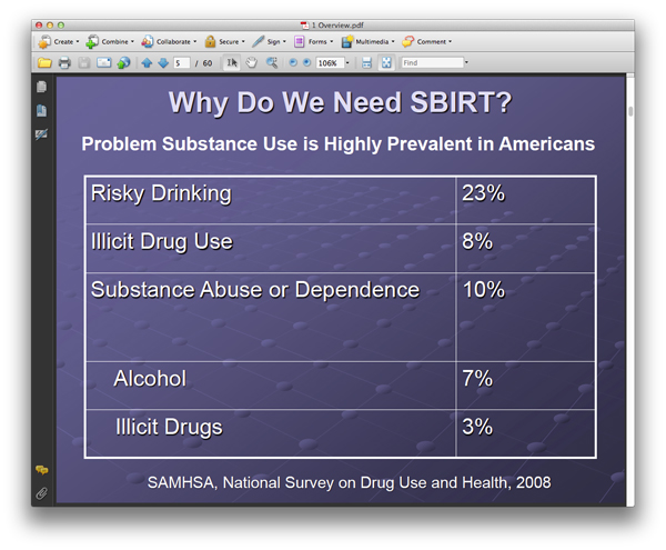 ClearHealth attends a major medical training [4.13.13] on addiction, including discussions on alcohol, tobacco, opioids and illicit drugs. The program discusses an effective practice to treat Substance Use Disorders: Screening, Brief Intervention, Referal and Treatment (SBIRT)