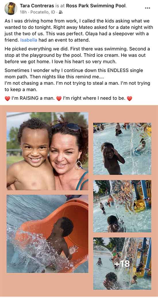Tara is clearly a loving and devoted mother. She spent the day at the swimming pool at Ross Park where I learned to swim as a youngster. Mateo is loved, but I was much more fortunate to have both a mom and dad to nurture and provide for me. Neither of my parents — alone — would have been able to provide financially for us as kids.