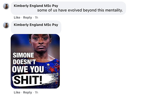 ME to Kimberly England MSc Psy — you “judged” Simone. Every athlete at the Olympics struggles with the mental pressure. That’s what I’m explaining to you. Those who can conquer their mind and fears have a shot at Gold. Those who cannot do not.
