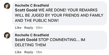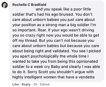 UPDATE: Rochelle C Bradfield responded to my messenger — then blocked me. She doesn’t mind killing a developing life. If she could, she would take a gun and kill me. I truly feel sorry for her and women like her. She needs anger management therapy.