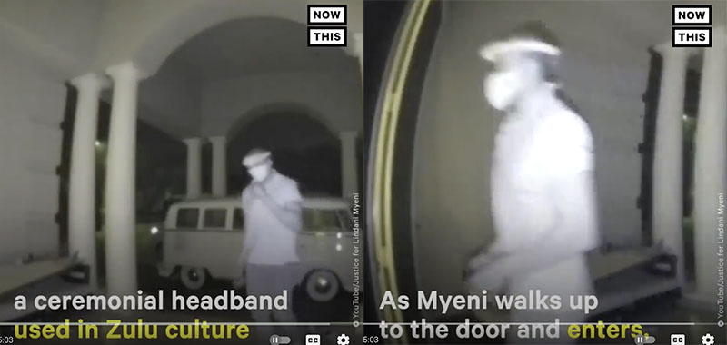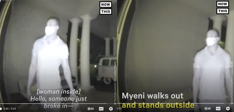 At 8:09:40 PM, the Ring.com video times out. Lindani spoke with the couple another three minutes. He was never violent. He was confused.