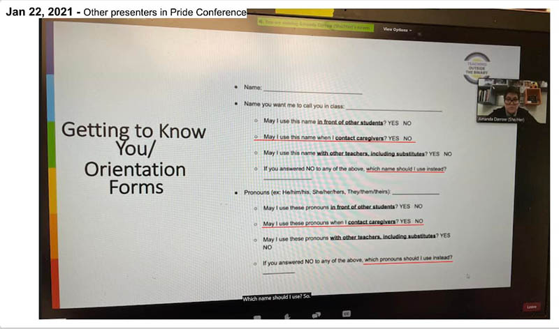 They promote dishonesty with parents in the name of safety and inclusion for students. They are told to ask students their preferred name and pronouns and then give students the option to keep their new name and pronouns a secret from their parents.