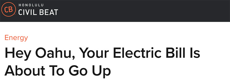Marcel Honore, reporting in Civil Beat, says Oahu households can expect to see monthly electricity bills increase by about 7% when Hawaiian Electric Company shuts down the state’s last remaining coal-fired power plant on September 1st and replaces the facility with another fossil fuel source: petroleum.