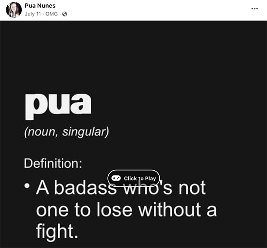 Pua Nunes has repeatedly attacked me. I walked away from our initial discussion. She posted an entire thread about me. She gaslighted me. She’s a passive aggressive narcissist, who freeloads in our islands.