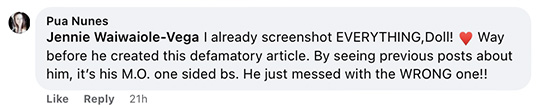 After Pua Nunes posted her initial comments, I challenged the unfair attack on our schools and teachers. We argued a bit and I walked away. Pua then posted a major attack on me the next day and called out all her squad to rush to her defense. Here are some of the individuals and comments. I’ve not included their mean attacks. They can add the slander if they wish.