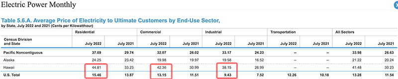 The chart below contrasts Hawai’i electricity rates compared to U.S. Total. For residential customers, electricity costs Hawai’i ratepayers $0.4481 per kWh, while U.S. Total is $0.1546 — nearly three times higher. Most costly for commercial: $0.4236 in Hawai’i compared to $0.1315 for U.S. Total; and more than four times more expensive for industry: $0.3815 in Hawai’i and $0.0943 U.S. Total.