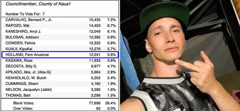 UPDATE November 9, 2022: Election results are in. Fern Ānuenue Holland did not make the cut. Fern has tremendous potential. Hopefully, this election taught her to be more inclusive. Dividing our community, excluding those with different opinions, will not lead to a stronger Kaua’i or Hawai’i. Mahalo Ke Akua!