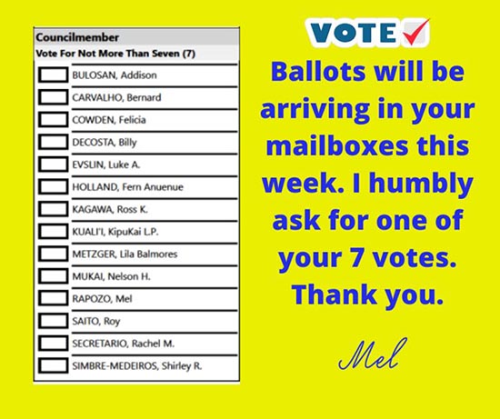 Top 14 vote-getters move on to general election in November: Six of top seven are current council members. Former Mayor Bernard Carvalho led with 7.4% of votes followed by Council Chair Mel Rapozo with 7.2%, former council member Arryl Kaneshiro (6.7%), Ross Kagawa (6.3%), KipuKai Kualii (6.3%), Felicia Cowden (5.7%) and Addison Bulosan (5.4%).