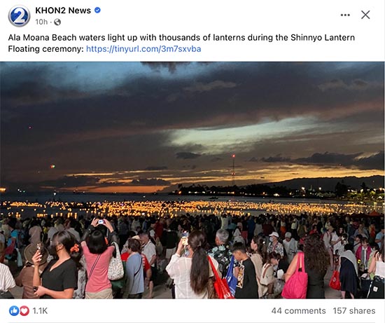 For the first three years, the event was held at Keʻehi Lagoon on the south shore of Oʻahu. In 2002, the ceremony was moved a few miles down the coast to Ala Moana Beach, where it has since been observed annually. Since lockdowns were set in place in 2020, the ceremony has been held in different formats while still remaining true to the spirit of its beginning. During the pandemic, Shinnyo Lantern Floating Hawaiʻi offered in-person interactive, as well as virtual, experiences. The ceremony at Ala Moana Beach fully resumed in 2023, allowing participants to share their inner light of shinnyo with the world.