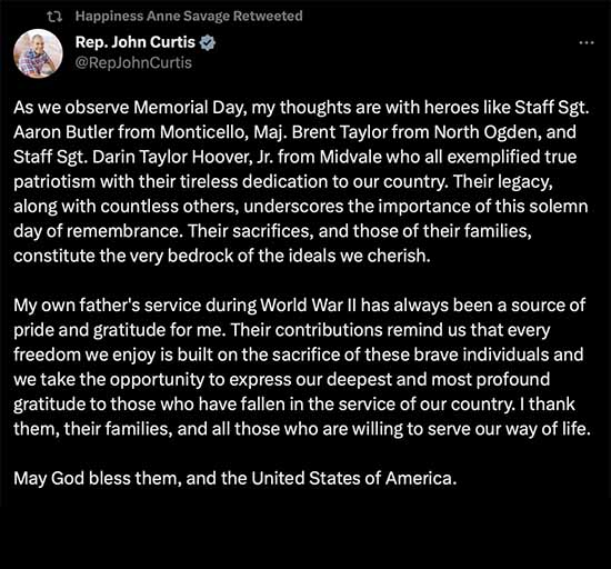 President Biden and Rep. John Curtis observed Memorial Day, “We will never be able to repay the debt we owe them.” Their legacy, along with countless others, “underscores the importance of this solemn day of remembrance.”