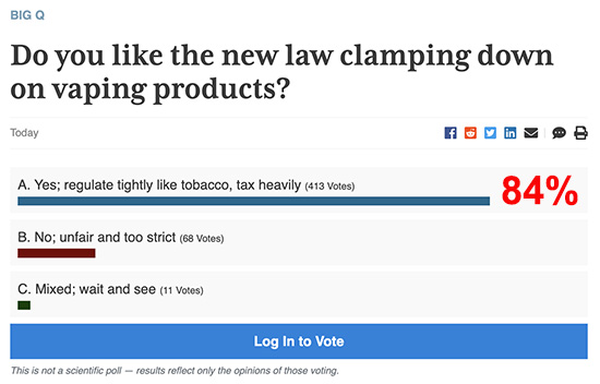 In StarAdvertiser’s unscientific Daily BigQ, June 8, 2023, 84% of respondents support tight regulations on vaping nicotine. Vaping however is harm reduction from smoking tobacco. CDC estimates over 480,000 Americans die each year due to cigarette smoking; some 41,000 die from secondhand smoke exposure.