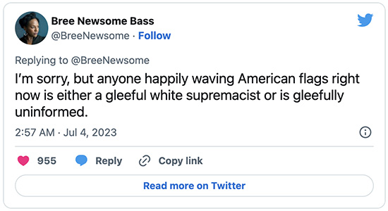 Cori Bush posted that the Declaration of Independence was written by enslavers and didn’t recognize Black people as human. In the 18th century, people around the world held slaves — slavery existed for 1,000s of years. Black, White, Asian, Native American — all owned slaves. Cori is correct. Enslavers did not recognize slaves as human. You know what else? People today, 2023, who demand abortion do not recognize the developing baby as human. Cori and Bree likely stand for abortion rights.