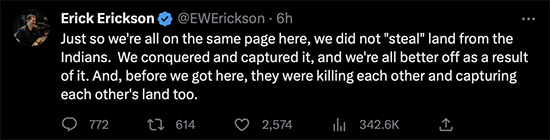 Erick Erickson points out an inconvenient truth: indigenous tribes fought each other, stole ponies or other goods, and killed each other over land or water rights. My Native American wife is not interested in returning to living in a tipi and bathing in a cold stream, we are better off today.