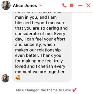 Jiali Ouyang, AKA Alice Jones, wrote, “Thank you for your candor and honesty, I appreciate it. I completely understand your preference for face-to-face interactions, they add depth to a relationship, and I equally agree with the idea of building a solid foundation before considering a long-distance relationship. I am curious and excited about continuing to get to know each other, and I believe that true connection happens when we are in each other’s presence. I’m looking forward to exploring where this relationship takes us and sharing those moments together!”