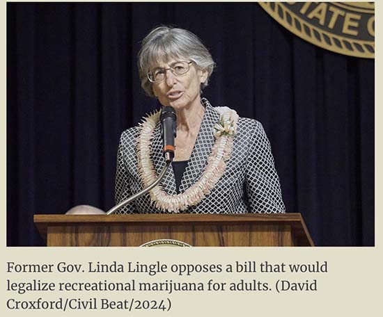 Lingle was joined by county police chiefs, prosecutors, Honolulu Mayor Rick Blangiardi and health advocates, who spoke against making cannabis legal. Pro-cannabis reformists were not invited. Lingle and the old ones are afraid to stand toe-to-toe with people like me.