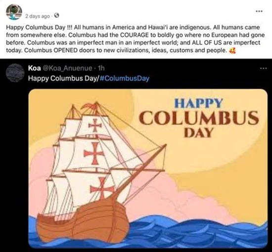 On Monday, October 14, 2024, my friend Koa (@Koa_Anuenue) posted a Happy Columbus Day meme on X (formerly Twitter). I liked the post and added a favorable comment. I do not support the current movement by the political Left to replace Columbus Day with Indigenous People’s Day. Why divide America and fight? It’s my opinion that Columbus Day should remain a national observation, while the USA adds an Indigenous People’s Day on a separate occasion. Let’s honor the memory of both. Diversity is our strength.