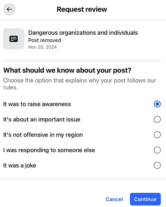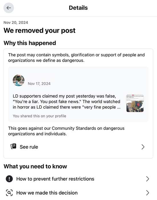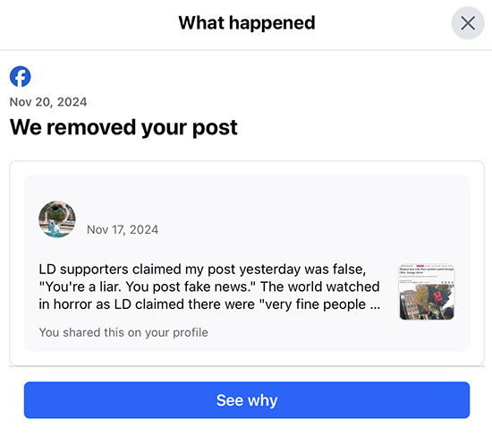 Today, November 21, 2024, Facebook notified me that my comment violated their Community Guidelines: