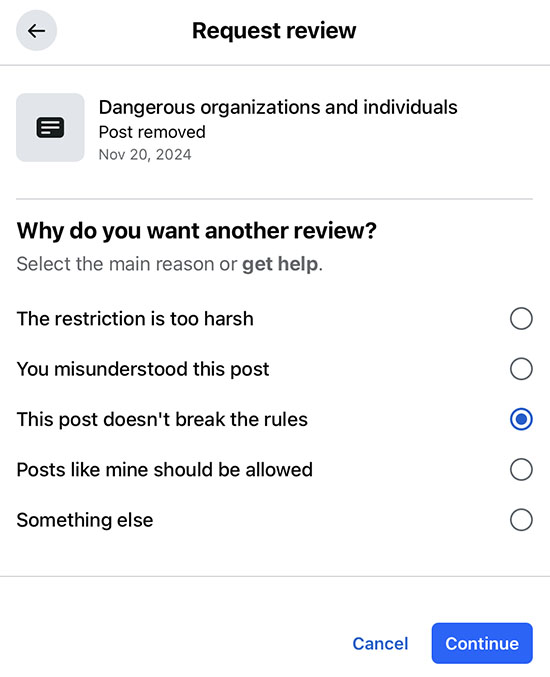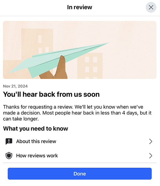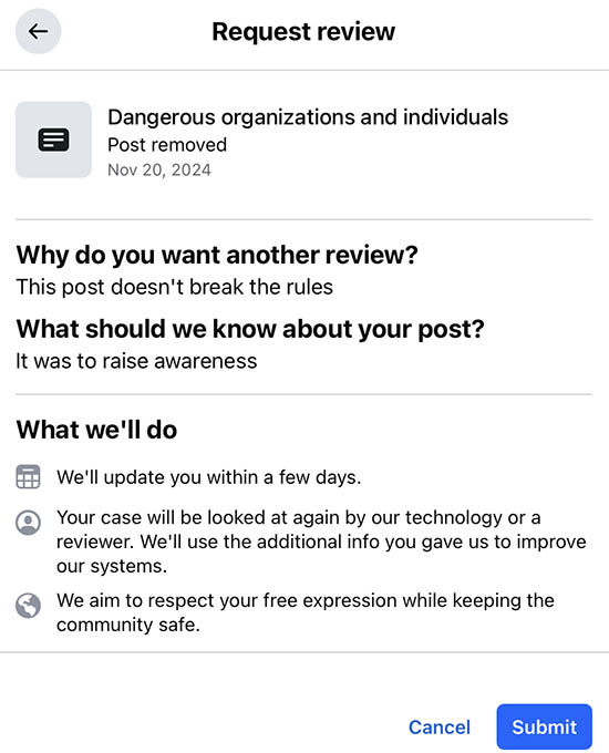 The summary of my Review Request to Facebook. I’m doubtful they’ll change their decision or even respond.
