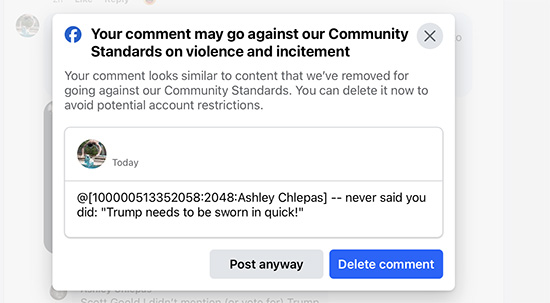 On November 17, 2024, Facebook warned me about a post. Responding to a comment from Ashley Chlepas, I wrote, “Never said you did: “Trump needs to be sworn in quick.” I’m not sure about the initial post or comment, but I don’t see how my statement violated their Community Standards on “violence and incitement.” In my experience, Facebook makes many poor decisions.