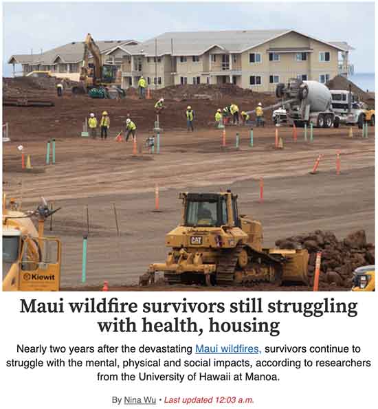 Nearly two years after the devastating Lahaina wildfires (8.8.23), survivors continue to struggle with mental, physical and social impacts, according to researchers from University of Hawai’i, Manoa.