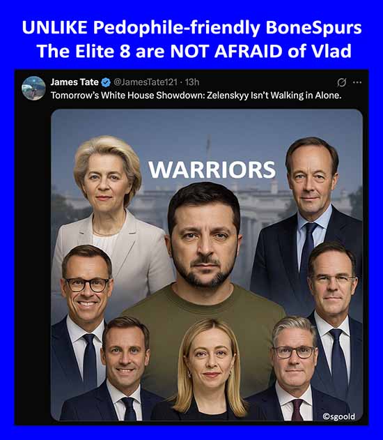 President Zelenskyy did not show up to a meeting with the US president alone this time. Europeans leaders had his back. The WARRIOR Elite 8 have spoken. Defend Europe from Vlad Putin.
