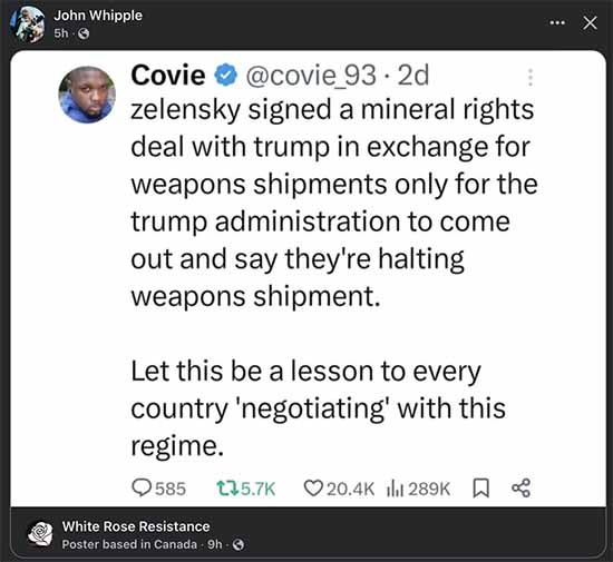 US President 47 demanded and made a “deal” with Ukrainian President Zelenskyy to provide USA with “rare earth minerals” in exchange for military weapons in their battle against Russia. Ukraine agreed to the deal. They uphold their end of the bargain. US President 47 now betrays his promise to Ukraine by blocking shipments of military weapons. The world cannot TRUST US President 47; the world cannot trust Americans. The entire world now PRAYS for our demise and collapse.