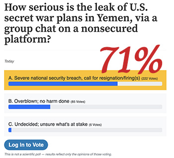 U.S. Senator Ron Wyden summarized the concern, “Obviously, my colleagues and I feel very strongly about the war planning meeting over unclassified phones. Obviously reckless, obviously dangerous, both the mishandling of classified information and the deliberate destruction of federal records or potential crimes that ought to be investigated immediately,” Wyden said. “And I want to make clear that I’m of the view that there ought to be resignation starting with the national security advisor and the secretary of defense.”