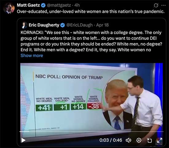 MAGA Males claim “over-educated, under-loved white [sic] women are this nation’s true pandemic.” NBC Poll asking opinion of Trump found White Men, No Degree supported Trump: +41; White Men College: +1; White Women No Degree: +14; and White Women College: -38. White Women with college history disapproved of President 47 the greatest. They are the foes of MAGA.