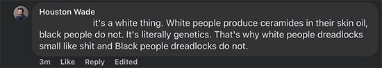 Houston, “it’s a white [sic] thing. White people produce ceramides in their skin oil, black [sic] people do not. It’s literally genetics. That’s why white [sic] people dreadlocks small [sic] like shit and Black people dreadlocks do not.”