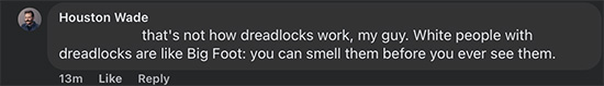 Seems to be a racist comment to me. I asked, “Tell me. When Bob Marley, Jamaicans, and Black folks sport dreadlocks, do they not smell like Big Foot or is it just a “White thang”?