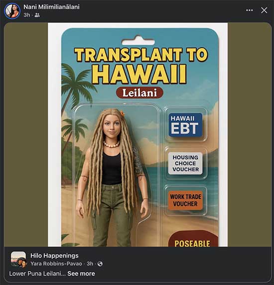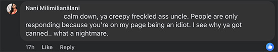Nani Milimilianālani, AKA Nani Moreman, posted a racist meme on her social media page today. After I complained, she posted the meme 2-3 more times. Asked why she continued to DOUBLE DOWN on the racism. Nani said to “make me famous white [sic] daddy.” OK. I’ll do my best.