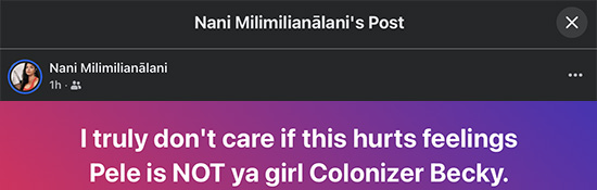 Nani Milimilianālani continues her assault on Americans by criticizing a White woman for respecting the Hawaiian mythological demi-god Pele. Nani wrote to Brodey Rhoades “do you need to read up on the history of why and how hawaiianan have been dispersed, diluted, and disenfranchised to lose all sense of self and agency. Get with the times homie, blood quantum only serves oppression.”