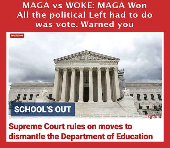 SCOTUS today sided with MAGA RETARDS. President FELON RAPIST 47 is shredding the U.S. Department of Education, which he considers the “head of the WOKE snake.” Elle doesn’t seem to get it. WOKE is dead in America. “Schools’ out, baby!” MAGA RETARDS roared, not WOKE women.