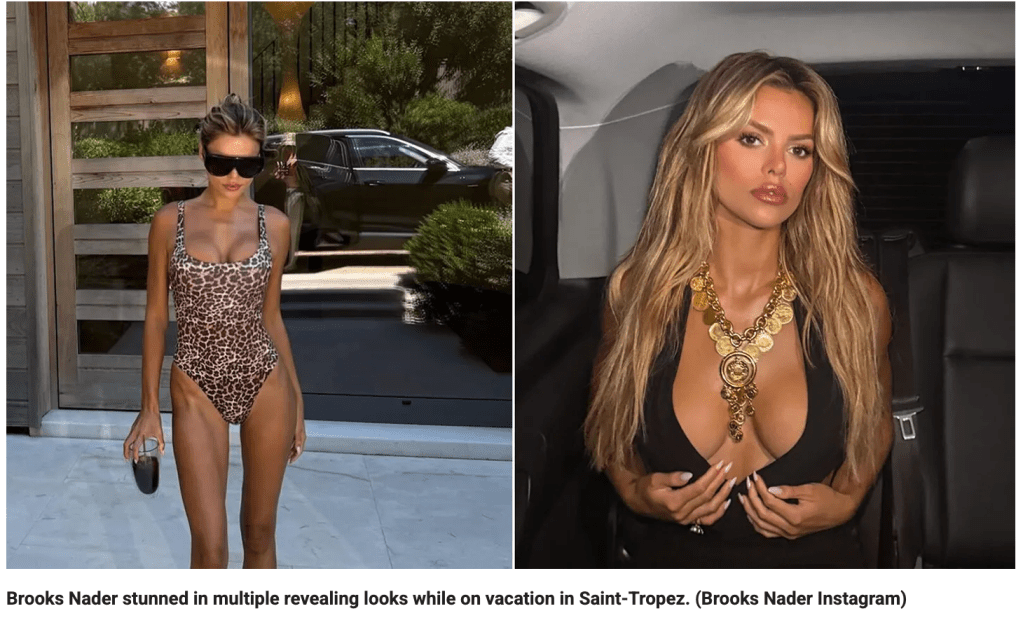 BROOKS NADER has the “perfect body.” She spends $10,000s on her hair; $10,000s on her make-up, false eyelashes, lipstick, nails, clothes, and likely, fake boobs, to make herself look beautiful. And, as society perceives beauty today, Brooks is beautiful.