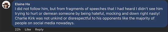 Regarding Charlie Kirk specifically, Elaine Ha wrote, “I did not follow him, but from fragments of speeches that I had heard I didn’t see him trying to hurt or demean someone by being hateful, mocking and down right nasty! Charlie Kirk was not unkind or disrespectful to his opponents like the majority of people on social media nowadays.”
