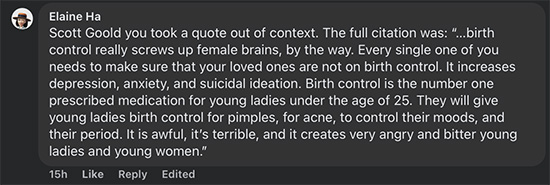 Elaine engaged me further, “Scott Goold you took a quote out of context. The full citation was: “…birth control really screws up female brains, by the way. Every single one of you needs to make sure that your loved ones are not on birth control. It increases depression, anxiety, and suicidal ideation. Birth control is the number one prescribed medication for young ladies under the age of 25. They will give young ladies birth control for pimples, for acne, to control their moods, and their period. It is awful, it’s terrible, and it creates very angry and bitter young ladies and young women.”