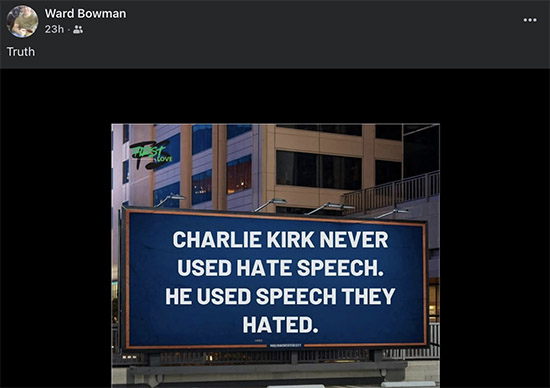 Ward Bowman, a real person, conservative and MAGA supporter, posted the following. The political Right has used the murder of Charlie Kirk to make political points and strengthen their ranks. Who is “they”? Had survey groups asked Americans a week prior to the killing, “Who is Charlie Kirk?”, I believe only 10% or so of Americans knew his name. MAGA has canonized Charlie Kirk to further their extremist agenda.