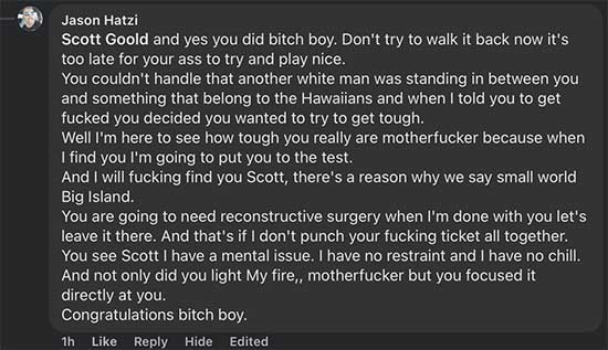 I reported his violent, threatening comment to Facebook on September 18, 2025, and also filed a complaint with the Hawai’i (Big Island) police department. I did not know Jason Hatzi. He took issue with my position on Kamehameha Schools. Jason Hatzi’s complete comment: