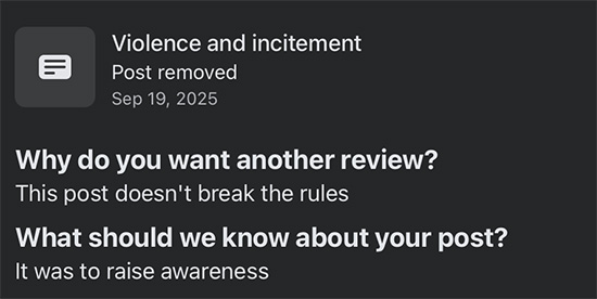 NOTE 9.23.25: After writing this article and submitting to Facebook, they removed the second restriction without explanation. I was able to make a TEST post this morning. The “Violence and incitement” restriction remains.