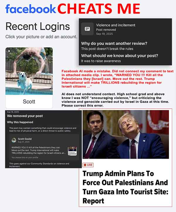 My post had been made weeks ago on August 31, 2025. I posted the headline, photo and article about “Trump Admin Plans To Force Out Palestinians And Turn Gaza Into Tourist State: Report” … I responded, as visible above: “WARNED YOU !!! Kill all the Palestinians they can. Move out the rest. Trump International will make TRILLIONS rebuilding the regions for Israeli citizens and…”