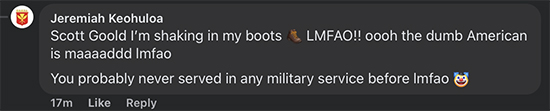 Scott Goold — I’m shaking in my boots 🥾 LMFAO!! oooh the dumb American is maaaaddd lmfao
