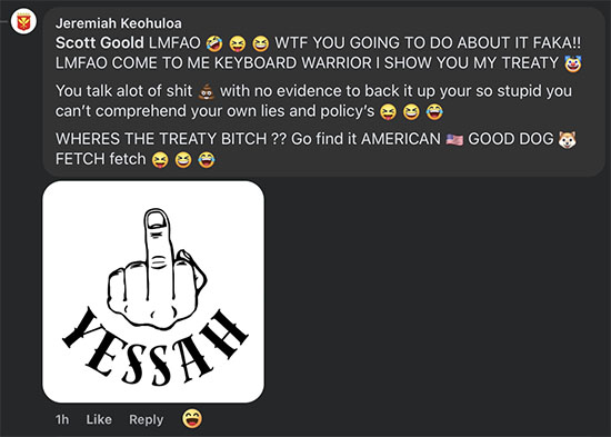 After I politely informed Jeremiah Keohuloa that he was mistaken legally, he responded with more uneducated and remarks: