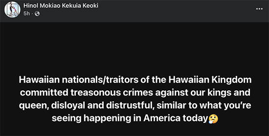 Keoks posted today, “Hawaiian nationals/traitors of the Hawaiian Kingdom committed treasonous crimes against our kings and queen, disloyal and distrustful, similar to what you’re seeing happening in America today” 🤔