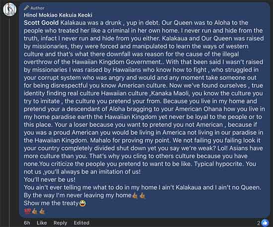 Keoks claims I live in “[his] home”??? Even if Keoks had land, I wouldn’t ask to live in his home. I’m happy where I live. I live in the 50th state in the United States of America, and Keoks shows the anger, hostility and lack of aloha in the Kanaka culture. My loyalty is to the U.S. Constitution and the American people. The Hawaiian Kingdom ended in 1895, when Queen Lydia Lili’uokalani pledged loyalty to the Republic of Hawai’i.