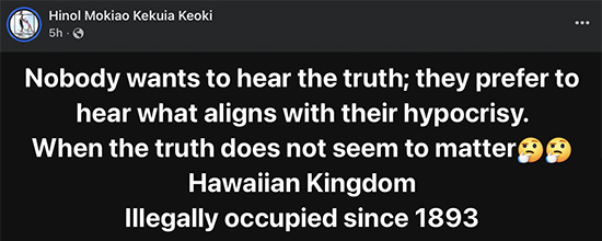 Mystic Mandy was responding to another misleading comment by Hinol Mokiao Kekuia Keoki. “Nobody wants to hear the truth; they prefer to hear what aligns with their hypocrisy. When the truth does not seem to matter🤔🤔 Hawaiian Kingdom. Illegally occupied since 1893.”