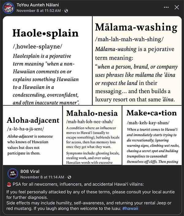 In a November 8th post that came across my social media newsfeed, Nālani posted a meme with Kanaka definitions that serve to disparage and ridicule non-Kanaka residents and visitors. The word “haole” means stranger, but Kanaka apply the label primarily to White Americans.