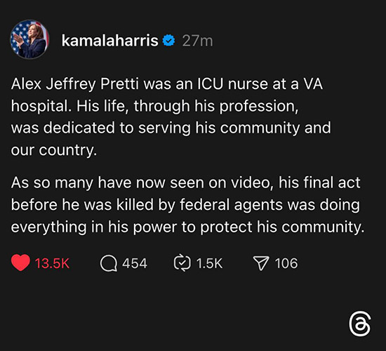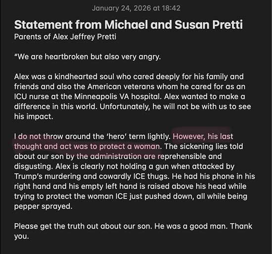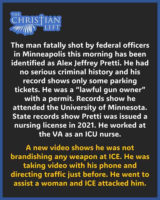 Alex Jeffrey Pretti was a 37-year-old nurse, a caretaker of veterans, a man whose colleagues said he was “quick with a joke” and whose “default look was a smile.” He spent his career in the ICU at the Minneapolis VA, holding the hands of dying soldiers, easing their pain, saving lives when he could. “He was a super nice, super helpful guy,” his colleague said, describing Alex as an “outstanding” nurse. His father described a son who “cared about people deeply and he was very upset with what was happening in Minneapolis.”