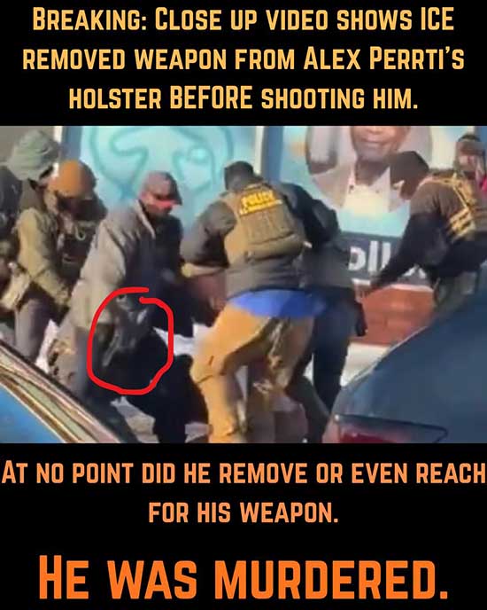 Video analyzed frame-by-frame by the New York Times tells a completely different story: “Footage of the encounter shows the man was holding a phone in his hand, not a gun, when federal agents took him to the ground and shot him.”