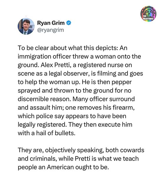 Today, within hours of Alex’s killing, Stephen Miller was already calling him a “domestic terrorist” who “tried to assassinate federal law enforcement.” Trump himself declared the agents who killed Alex “patriots” — the same word he used for the January 6th insurrectionists he pardoned on his first day back in office — while accusing Governor Walz and Mayor Frey of “inciting insurrection” for daring to criticize the killing.