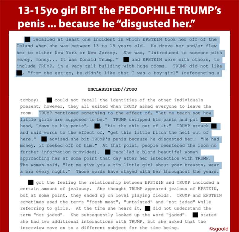 UPDATE 3.6.26: PEDOPHILE president tried to block release of the files; tried to block release of documents related to him. Finally, The People prevailed. Donald J Trump is a PEDOPHILE … he tried to force a 13-15 year old to suck his dick, give him a blowjob. Apparently, she bit his penis !!! Good for her. It appears Trump, friends and supporters threatened this young woman for years to keep her from bringing official and formal charges.